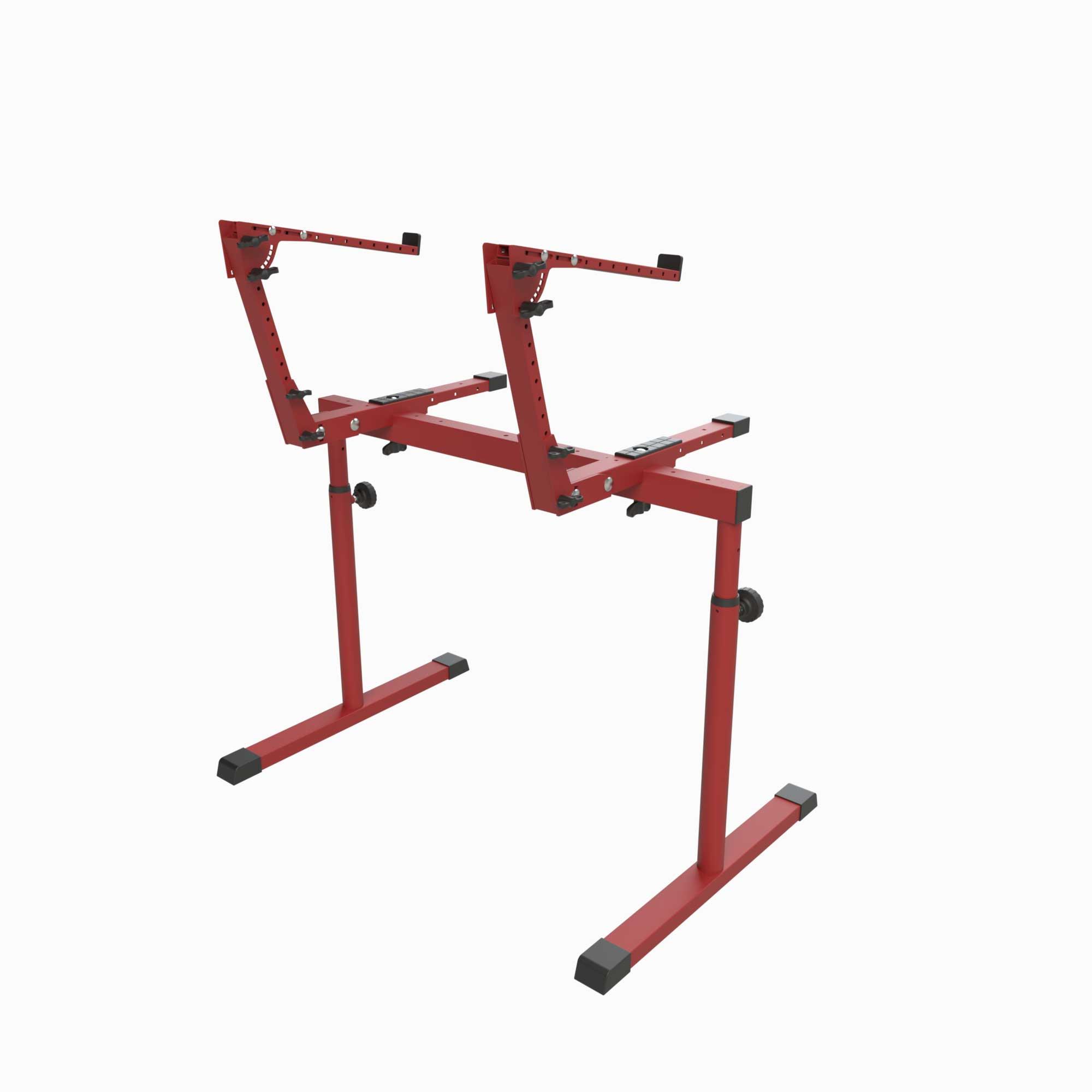 Both tiers accommodate optional shelves such as the Freijo tres, quatro, and dois, making it easy to add synthesizers, amps, or effects.